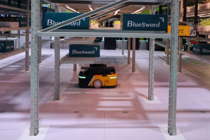 兰剑智能实地还原“蜘蛛侠:Sky-shuttle”智能系统的业务场景,机器人可在货架间横向、纵向、垂直三维立体自由穿梭,应用在仓储物流、智慧ac米兰比赛现场直播等不同场景。