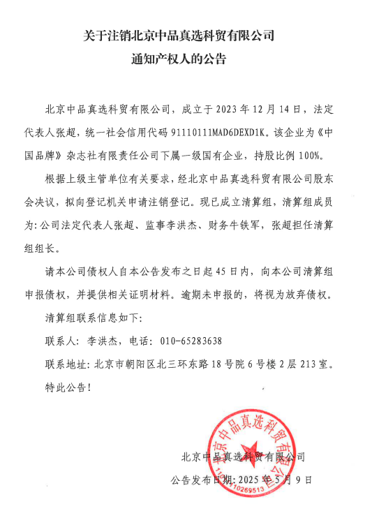 根据上级主管单位有关要求,经北京中品真选科贸有限公司股东会决议,拟向登记机关申请注销登记。