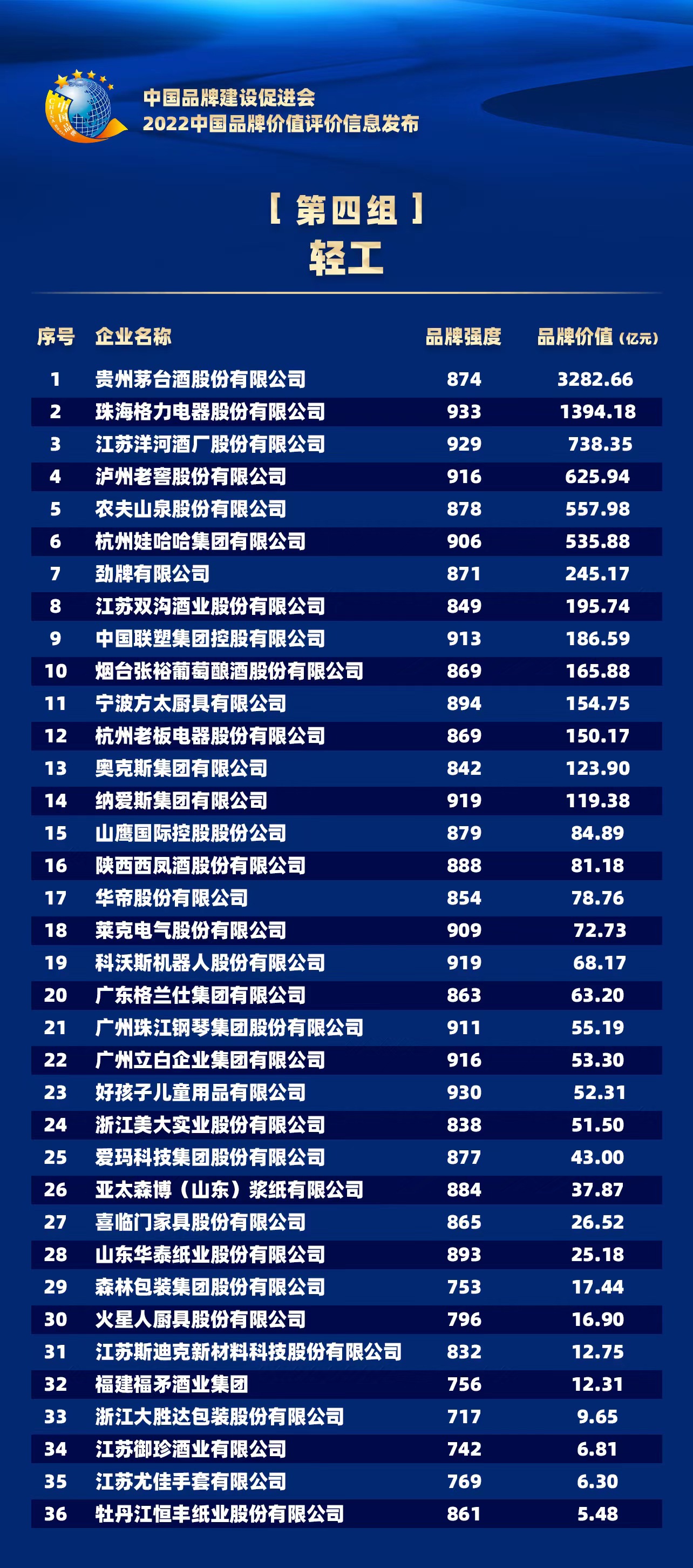 贵州茅台酒股份有限公司以3282.66亿元品牌价值,继续蝉联轻工领域第一,位列总榜第二